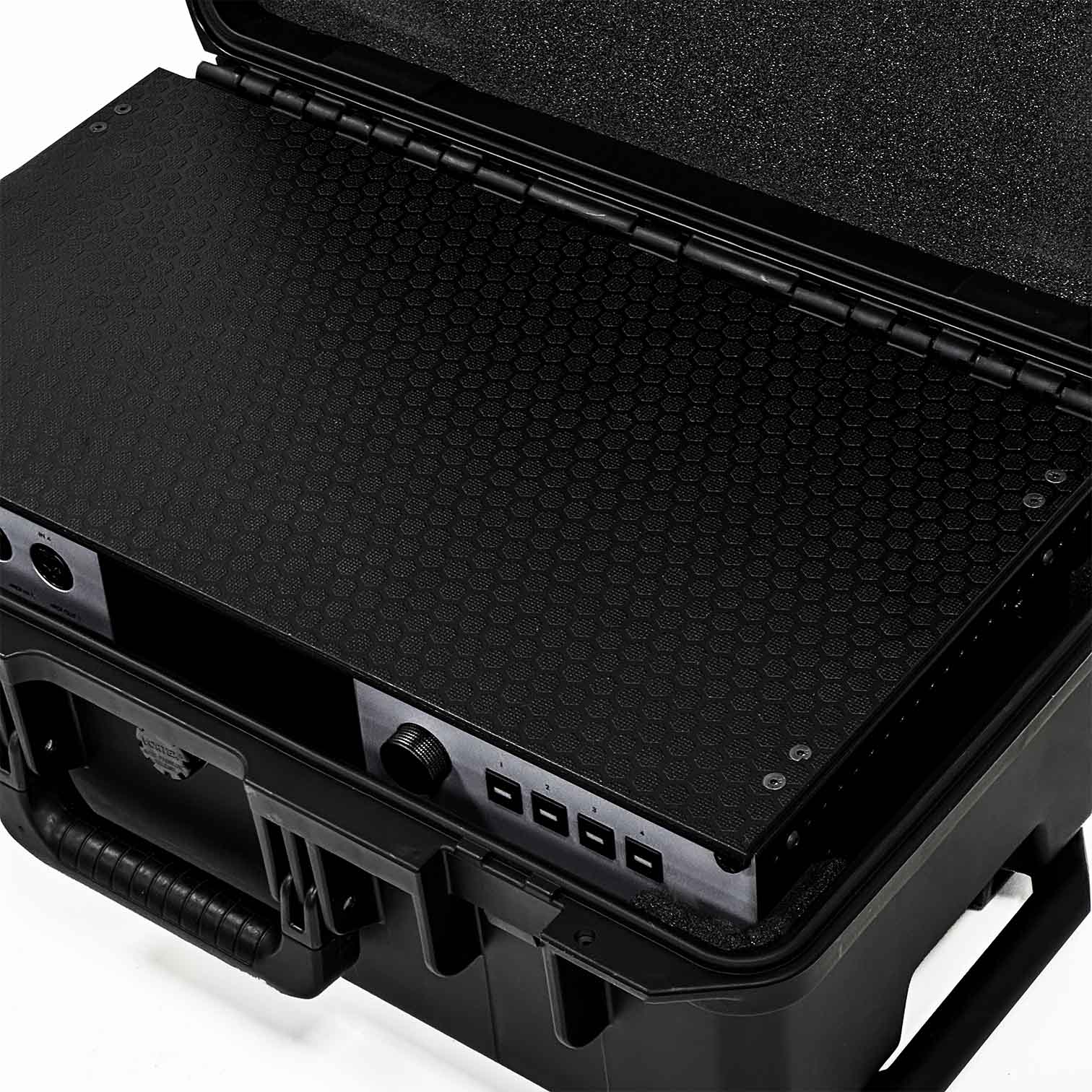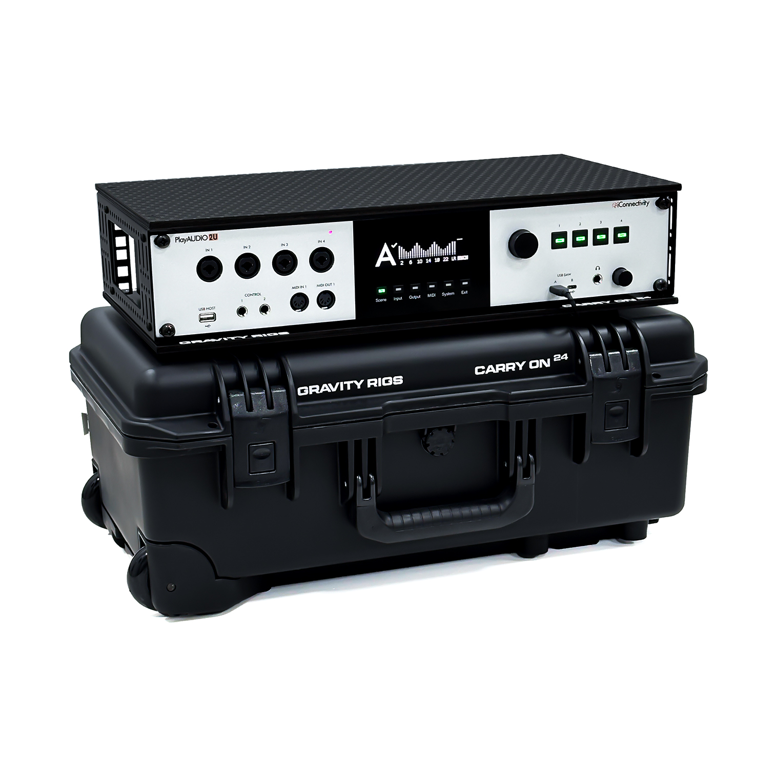 The PlayAUDIO2U is housed in our signature Gravity Rigs Carry On Transit System, designed and engineered in house and manufactured in the UK. The casing also provides a space to house 2 laptops safely within our custom foam design - another unique and useful feature.