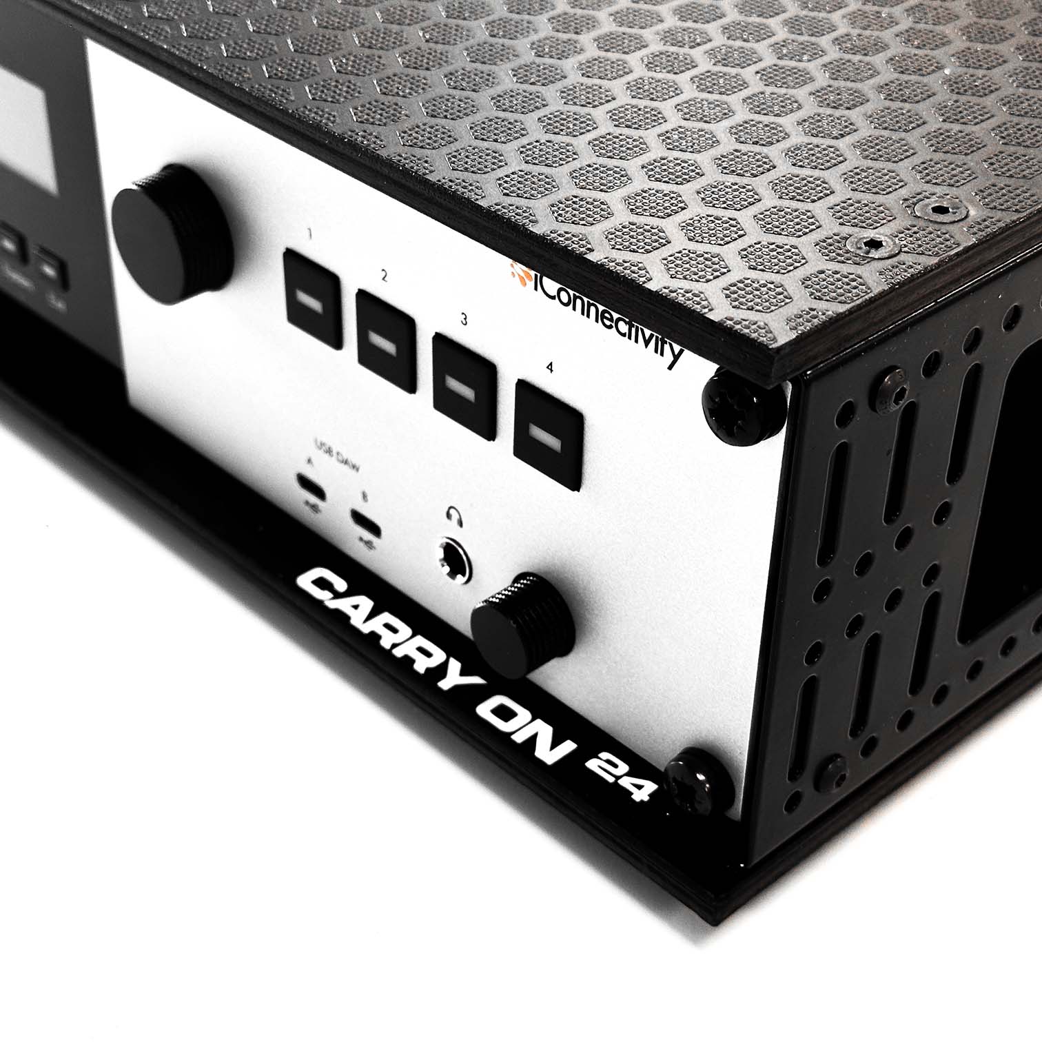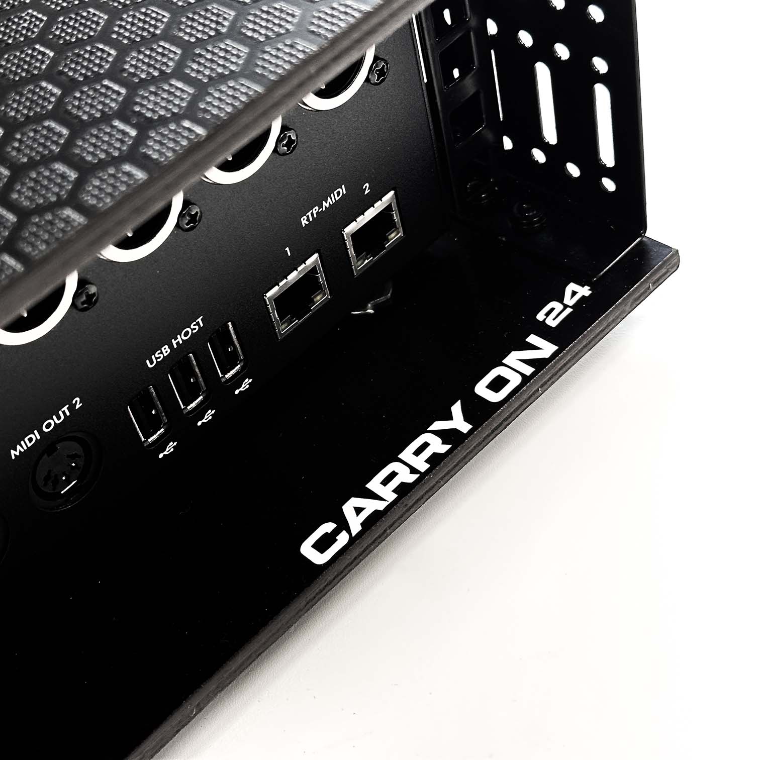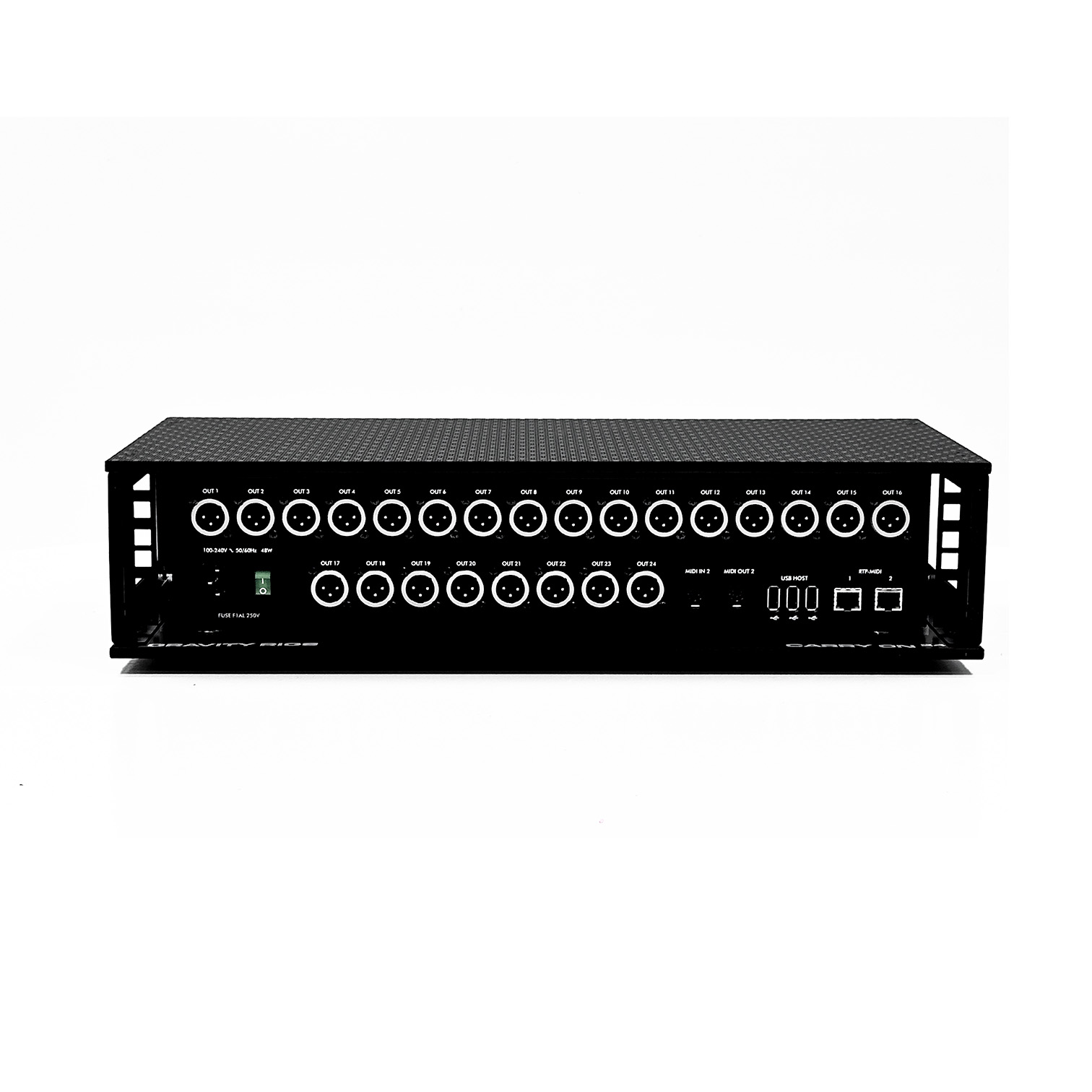 The Carry On 24 is the central hub of your live setup, with 24 XLR audio outs, 4 TRS / XLR Audio inputs, dual MIDI DIN I/O connections, RJ 45 Network ports and a wealth of USB Host ports - with 110V-240V power for global touring.