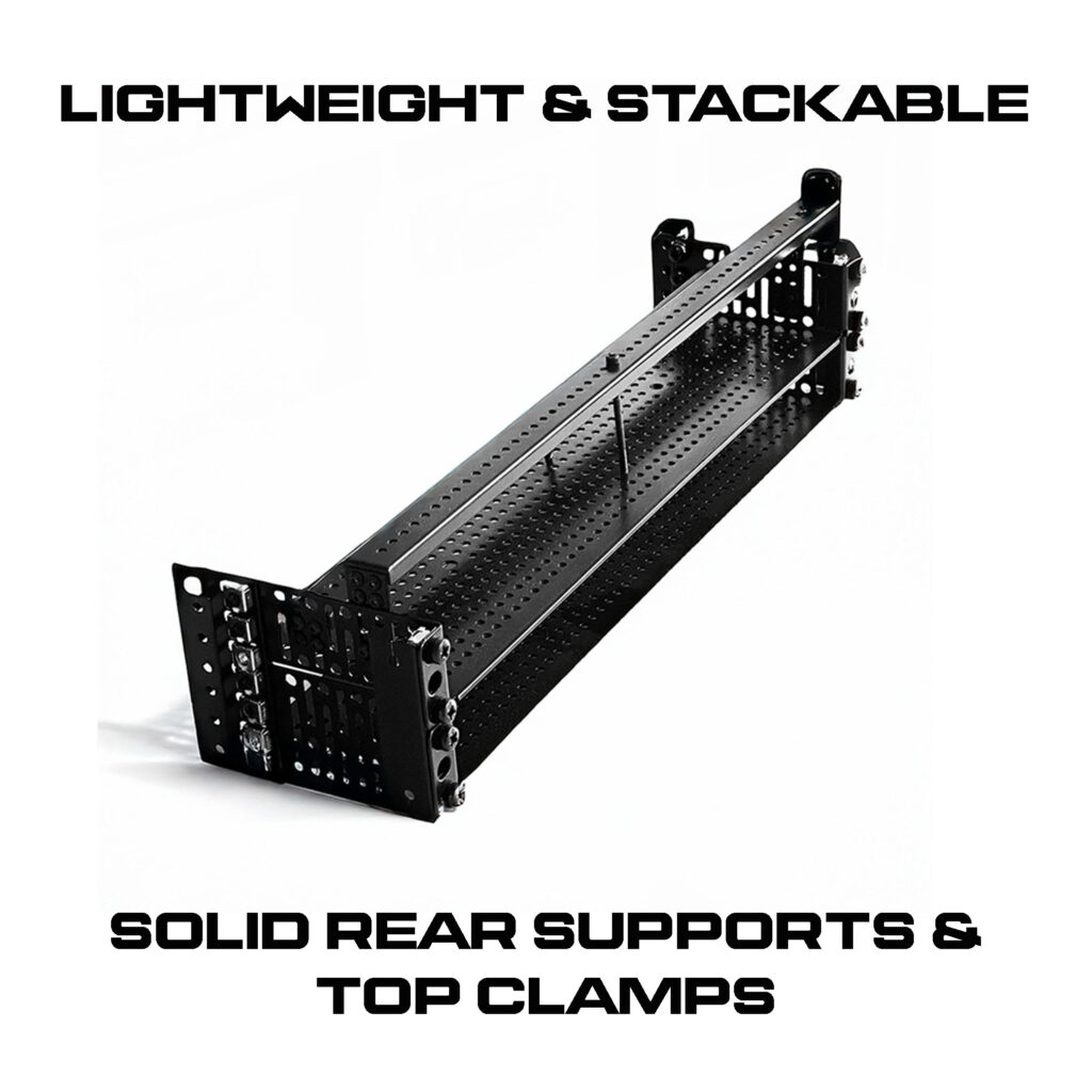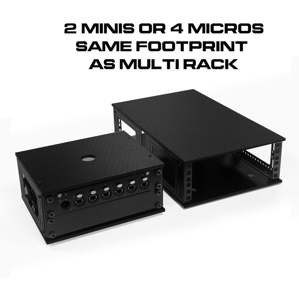 Our Mini and Micro Sat tessellate into the same footprint as Multi-Rack, allowing different pieces of hardware to be packed, combined or flown to shows without wasted space